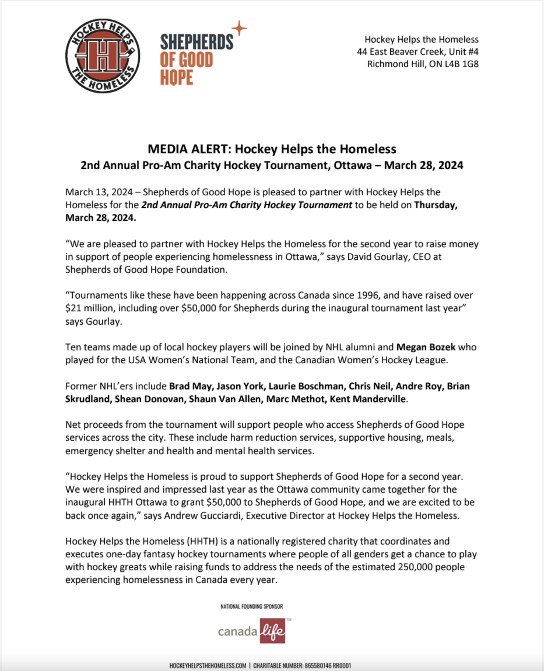 The 2nd Annual Hockey Helps the Homeless Charity Hockey Tournament is back – March 28, 2024! Join us and NHL Alumni as they join ten teams to raise $ for Shepherds of Good Hope.