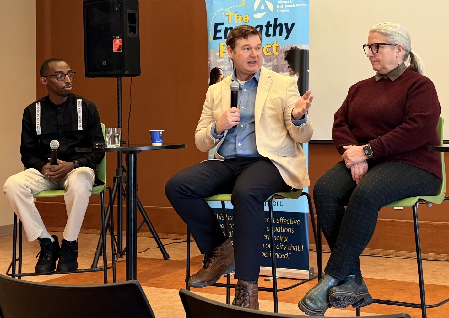 Shepherds of Good Hope manager, Beni Rutimirwa (left), a key member of the diversion pilot project team, moderates a panel session with Michael Lethby (Niagara Resource Service for Youth, RAFT) and Sandra Clarkson (Calgary Drop-in Centre) during Shelter Transformation Week (Jan 26-30, 2026). Both organizations have implemented shelter diversion with transformational success.
